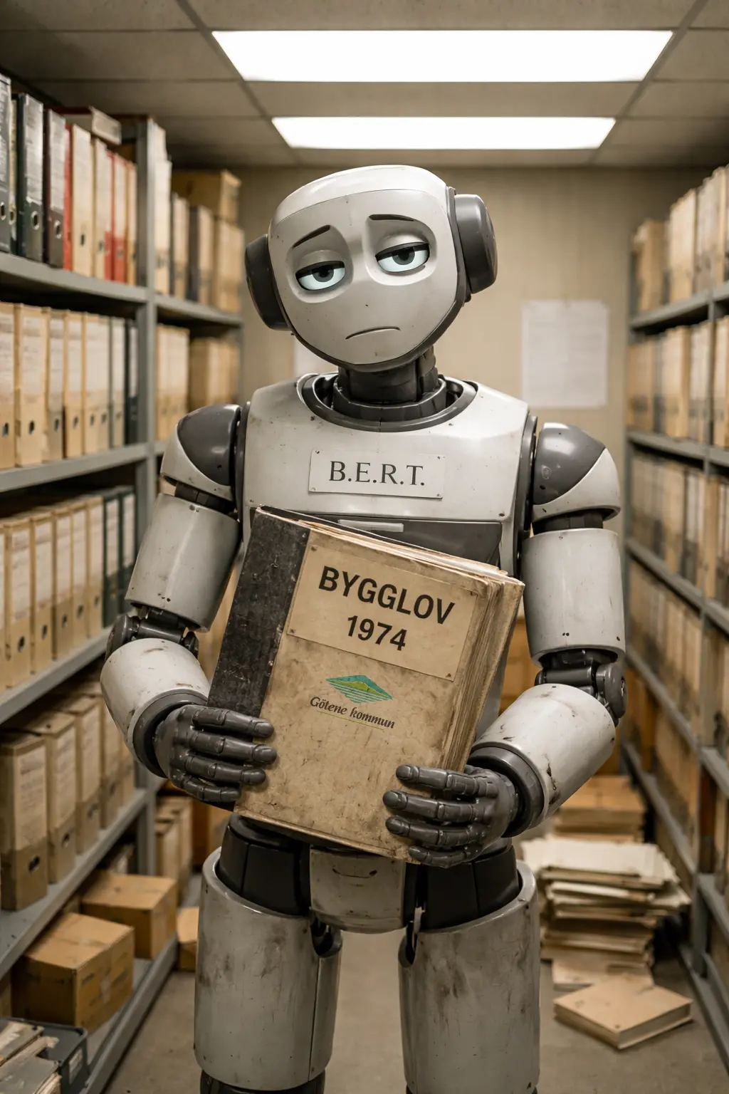 Förstora bildenB.E.R.T, munter i sin nya roll i kommunens källararkiv.