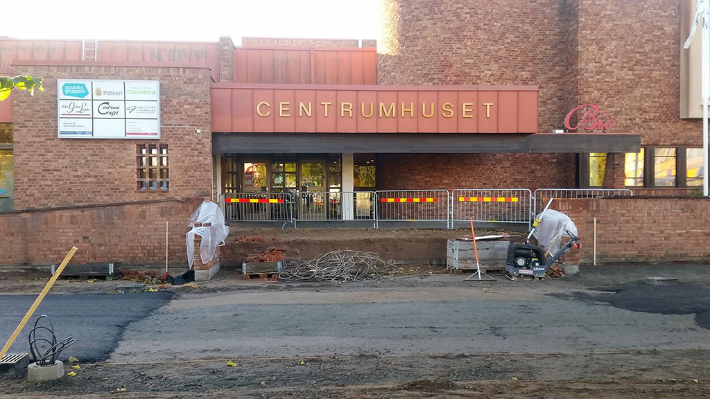 Det har nu blivit dags att renovera ytan framför entrédörrarna till Centrumhuset. Den befintliga markvärmeanläggningen repareras och ny installeras där det behövs för att förebygga risken för halkolyckor. Därefter kommer nya plattor att läggas på plats. Detta arbetet kommer att göras i två etapper och under första etappen kommer entrédörrarna till Centrumhuset att vara helt avstängda.