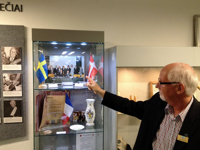 Förstora bildenKenth Selmosson, på muséet i Pasvalys, pekar på vänortsavtalet som undertecknades 1992. Klicka på bilden för att förstora.