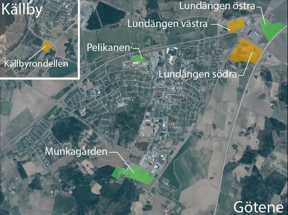 Kartan nedan visar ledig kommunägd mark planerad för näringsverksamheter. Gröna ytor visar mark som är byggbar idag. Orangea ytor visar mark som är under framtagande.