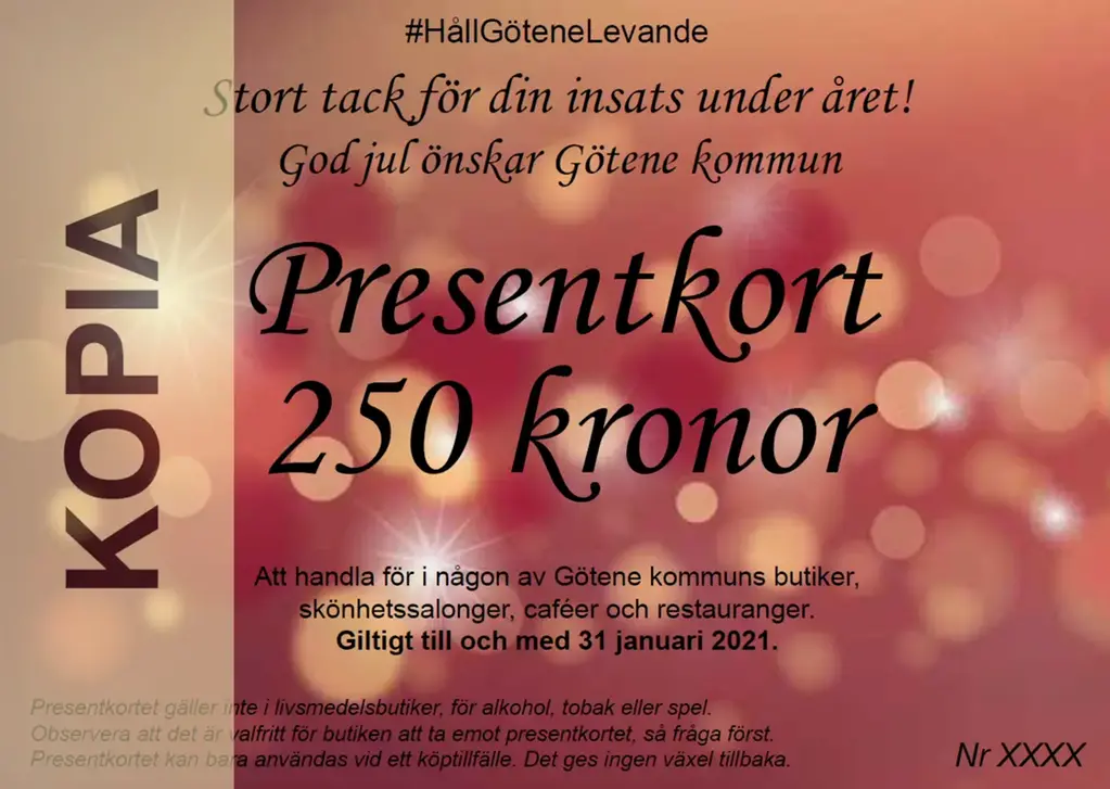 Som ett bidrag till den lokala handeln är årets julklapp till kommunens anställda ett presentkort på 1000 kronor som kan nyttjas i butiker, caféer, restauranger och skönhetssalonger i hela Götene kommun. Vi hoppas att detta kan vara en stöttning i en utmanande tid.
