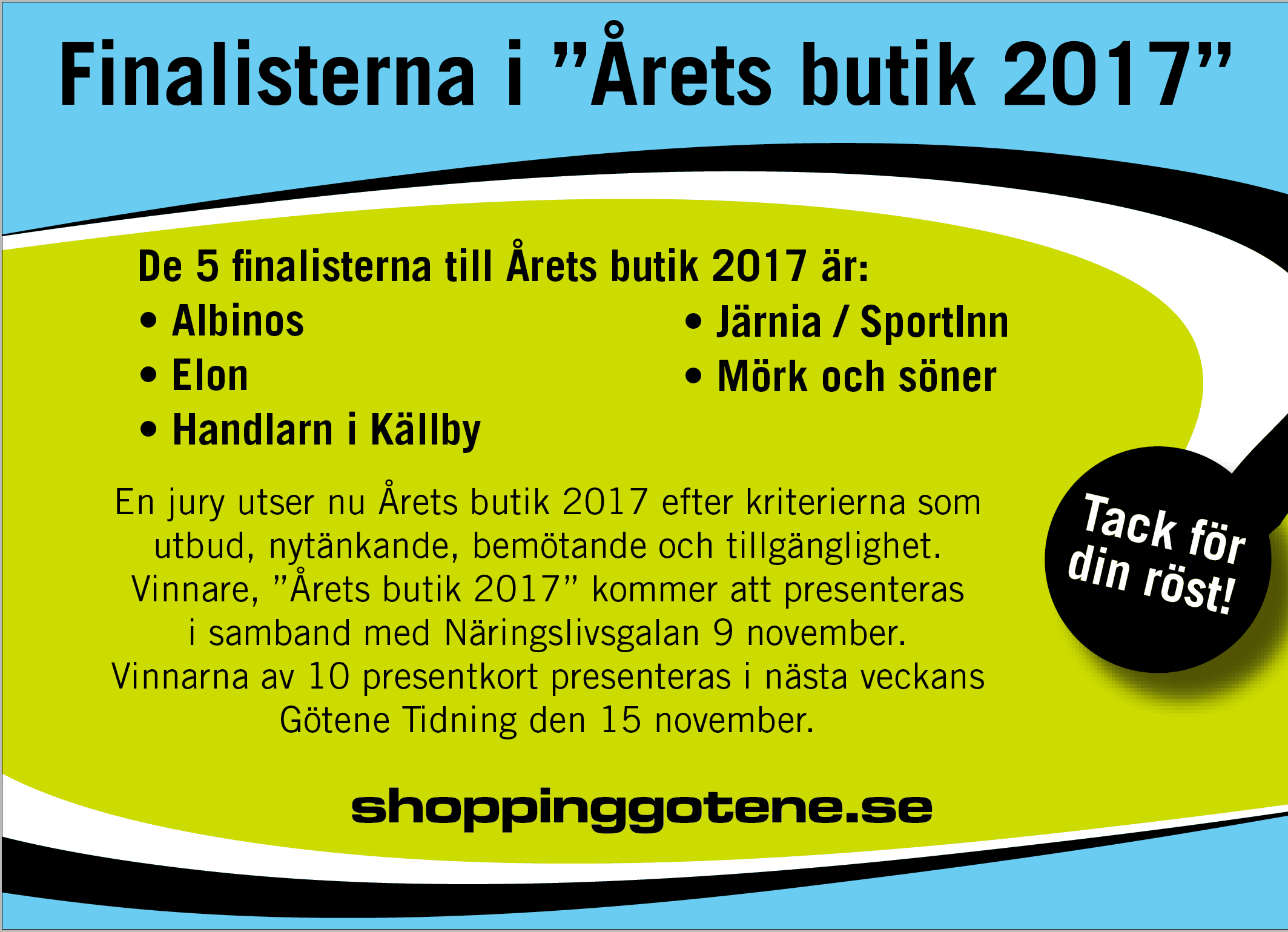 En jury utser nu Årets butik 2017 efter kriterierna som utbud, nytänkande, bemötande och tillgänglighet. Vinnare "Årets butik 2017" kommer att presenteras i samband med Näriungslivsgalan 9 november. Vinnarna av 10 presentkort kommer i nästa veckans Götene Tidning 15 november.