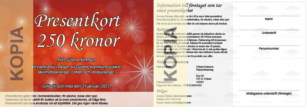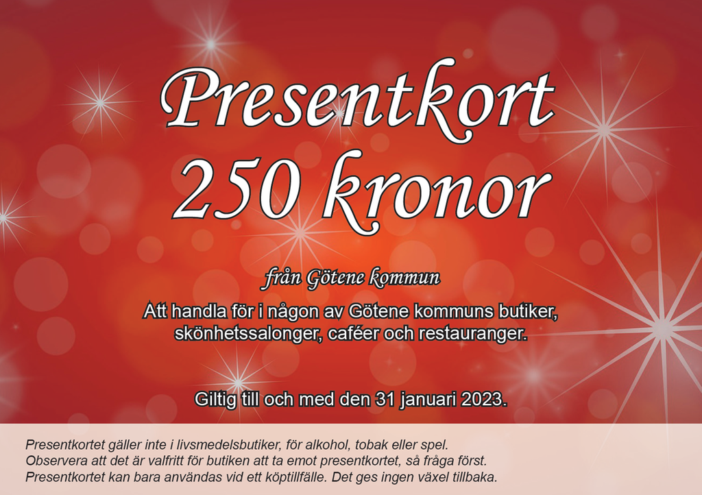 Varje anställd kommer att få två stycken presentkort på 250 kronor. Presentkorten kommer att gälla i alla butiker, restauranger, caféer och skönhetssalonger i Götene kommun som väljer att ta emot dem. Presentkortet gäller ej i livsmedelsbutiker, för alkohol, tobak eller spel. Du som företag väljer själv om du vill ta emot detta presentkort.