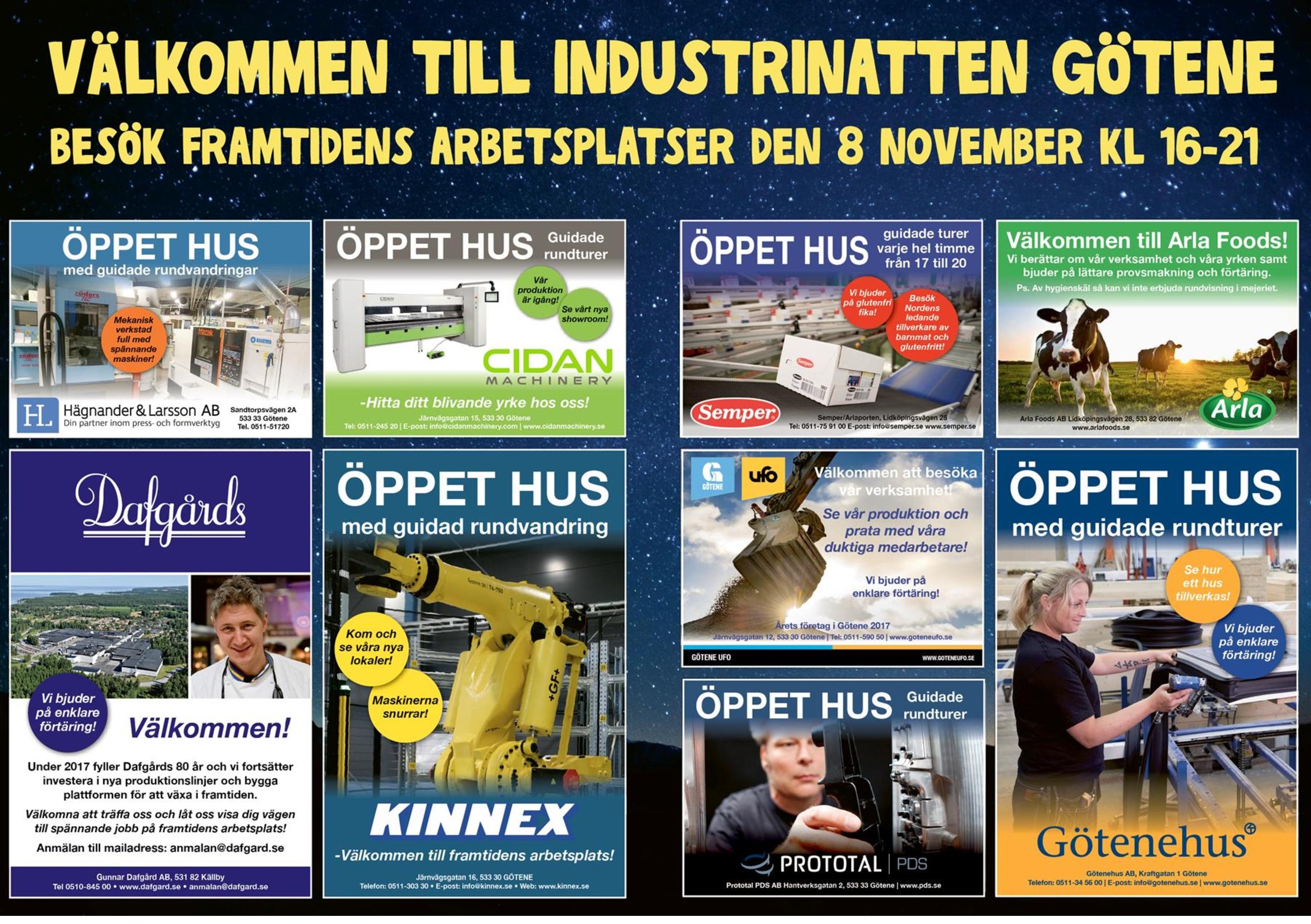 Under Industrinatten den 8 november öppnar tillverkande industriföretag i Götene kommun sina dörrar. För elever, lärare, föräldrar, arbetssökande, nyanlända med flera visar de hur moderna industriföretag arbetar idag. De visar spännande produkter, ny teknik, schyssta arbetsmiljöer och vägar till framtidsjobb.
