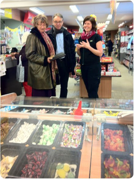 Ägaren Ulrika Håkansson visar Gert Rahm och Ann-Marie Widegren en del av godissortimentet.