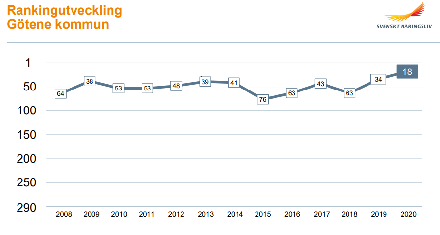 Det var jubel och glädje i Centrumhuset när Svenskt näringsliv släppte sin årliga ranking av Företagsklimatet. Enligt rankingen är Götene den 18:e mest företagsvänliga kommunen i Sverige. Det är en hög placering då landets alla 290 kommuner är med. Det är även den högsta placeringen kommunen haft i rankingen sedan den startade för 20 år sedan.
