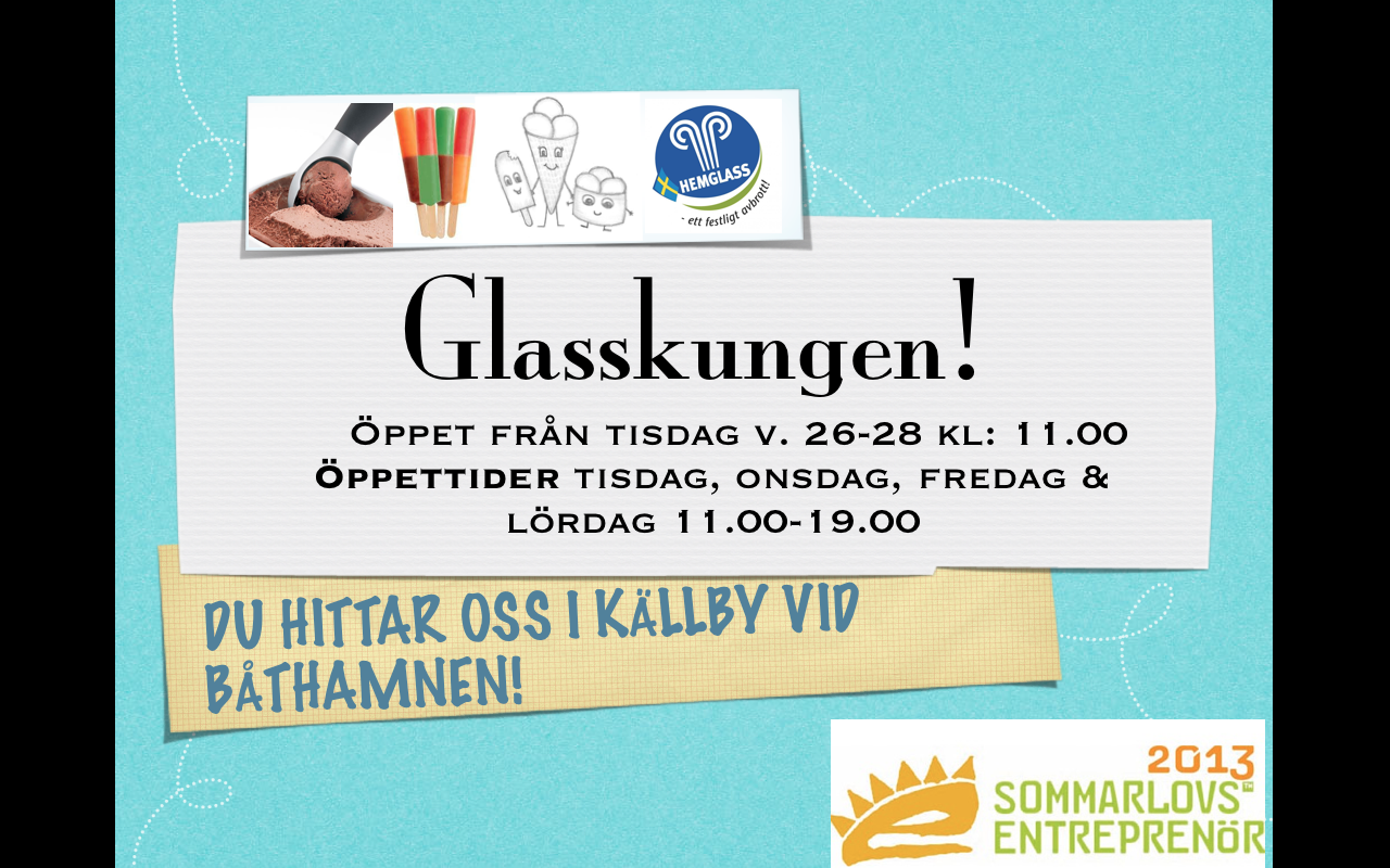 Glasskiosken Glasskungen öppnar tisdagen den 25 juni och har sedan öppet tisdagar, onsdagar, fredagar och lördagar till och med 13 juli.
