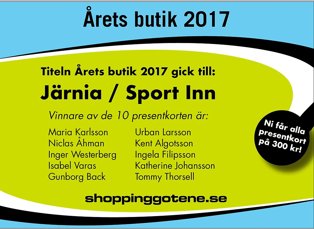 På näringslivsgalan igår utsågs titeln Årets butik 2017. Kunderna har under hösten kunnat nominera butiker i Götene kommun. En jury utsåg Järnia/Sport Inn till Årets butik 2017 efter kriterierna som utbud, nytänkande, bemötande och tillgänglighet.