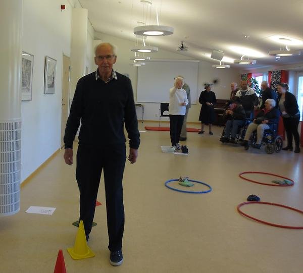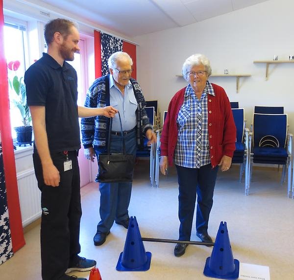 Efter denna inledning fick alla deltagare pröva på praktiska övningar uppdelat i olika stationer där ytterligare två sjukgymnaster från Götene kommun fanns med. Deltagarna fick prova balansen på sviktande underlag, testa att resa sig upp utan stöd, gå slalom med mera.