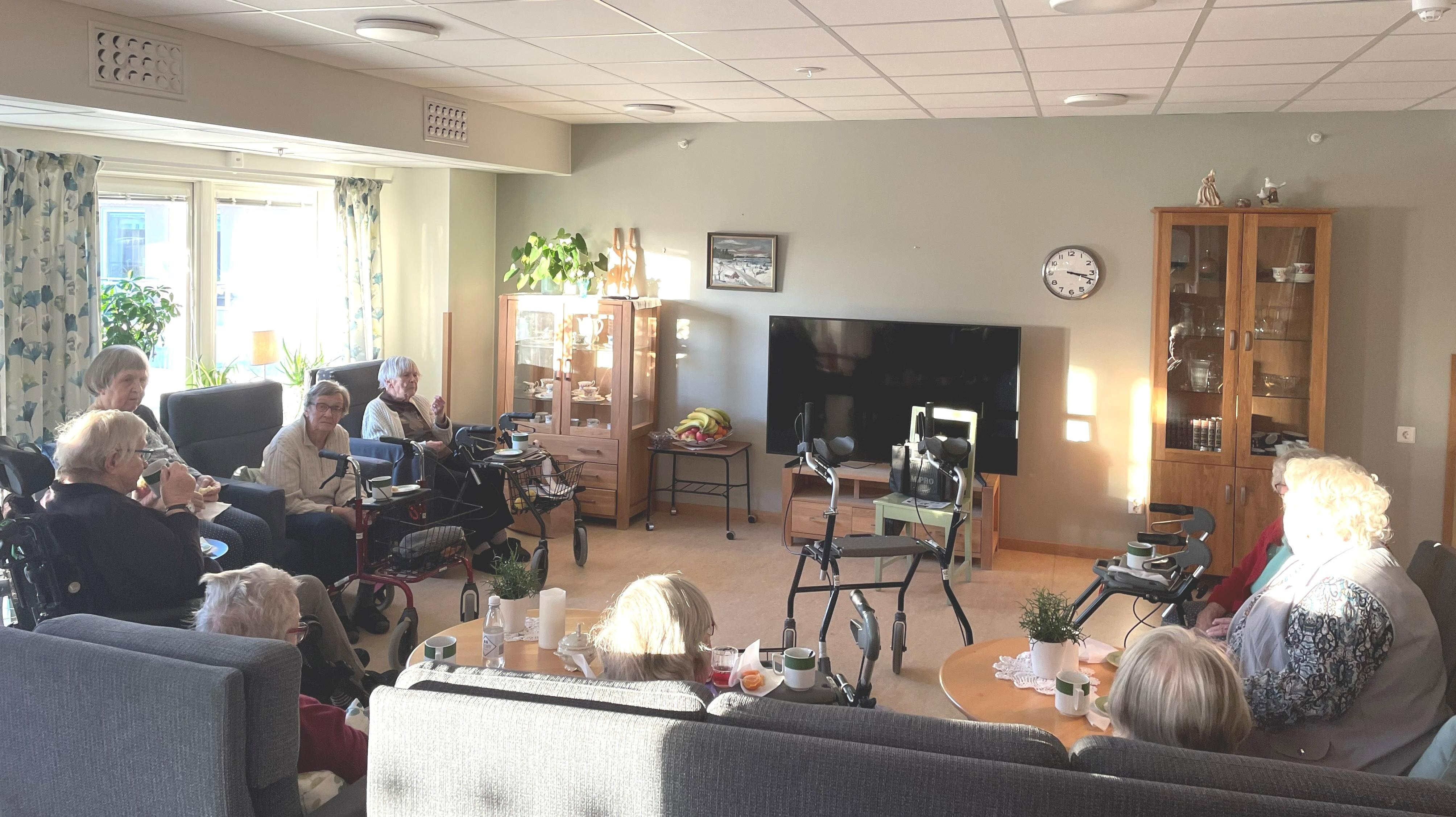 På Kastanjegården, Götene äldrecenter våning tre samlades man under tisdags eftermiddagen för att "provköra" den nya mobila förstärkaren. Det blev en fin stunds gemenskap, personalen använde den nya mikrofonen vilket gav samtalet extra ljud, man lyssnade till musik och planerade vidare för fler aktiviteter.