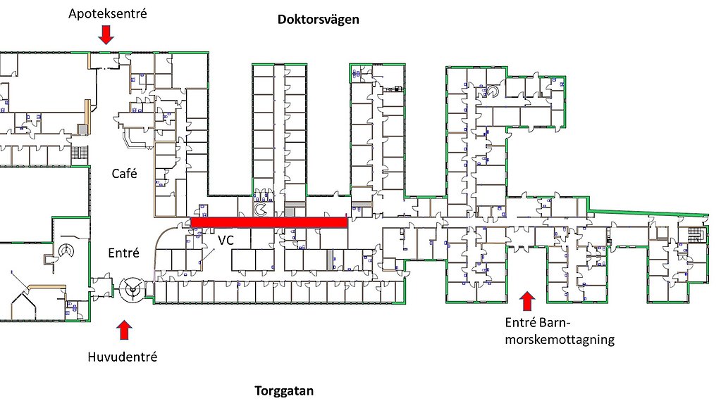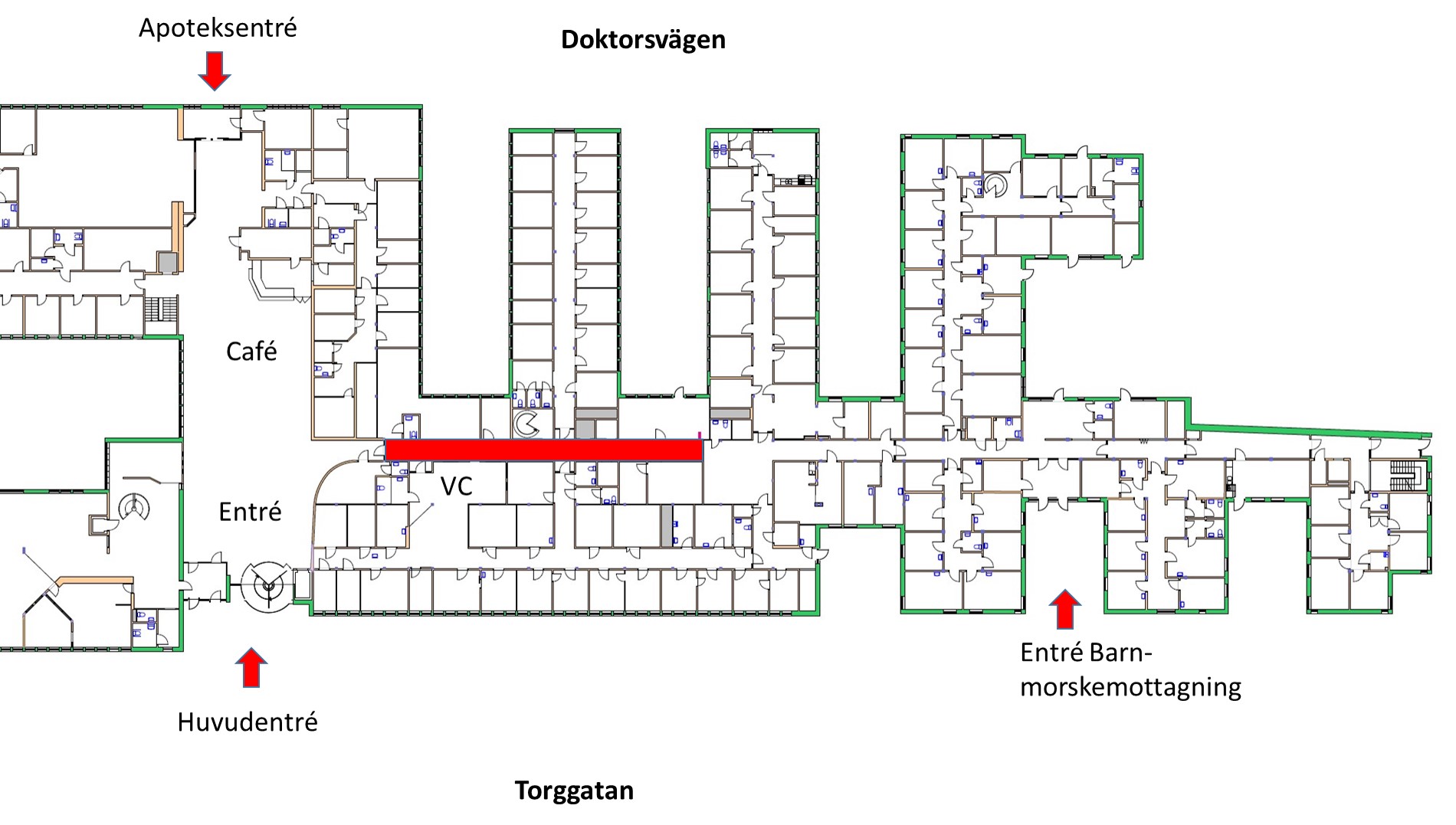 Förstora bildenKlicka på bilden för att förstora. Skiss över Centrumhusets entréplan. Rödmarkering visar korridoren utanför vårdcentralen som begränsas.