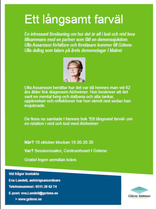 En intressant föreläsning om hur det är att i lust och nöd leva tillsammans med en partner som fått en demenssjukdom. Ulla Assarsson författare och föreläsare kommer till Götene. Ulla deltog som talare på årets demensdagar I Malmö