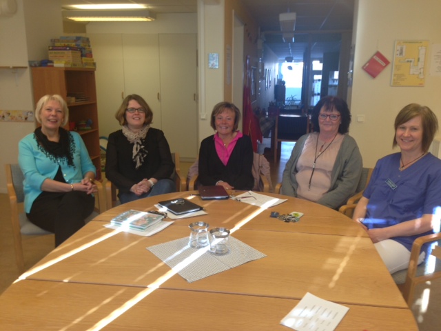Från vänster: Susann Sunberg förskollärare och samordnare, Theres Ericsson 1:e socialsekreterare, Anette Gustafsson LSS-handläggare, Carina Käll socionom, Annkatrin Fredriksson Distriktssköterska Närhälsans BVC. Frånvarande Anna Claesson specialpedagog, Ann-Sofie Lindén barnmorska, Elisabeth Svantesson distriktsköterska Kinnekullehälsans BVC