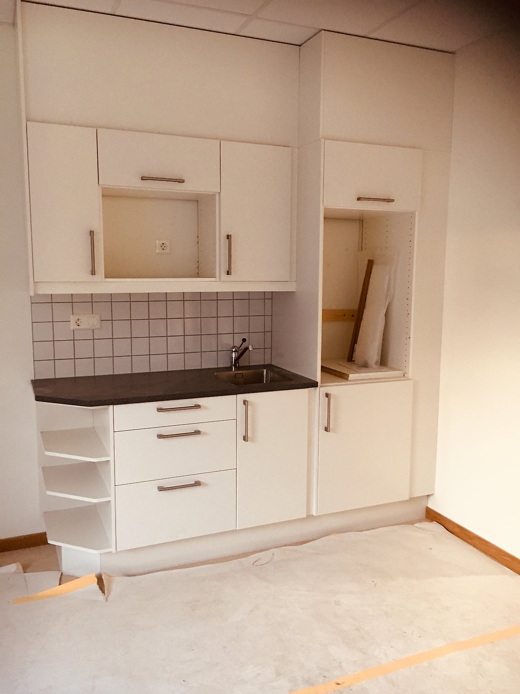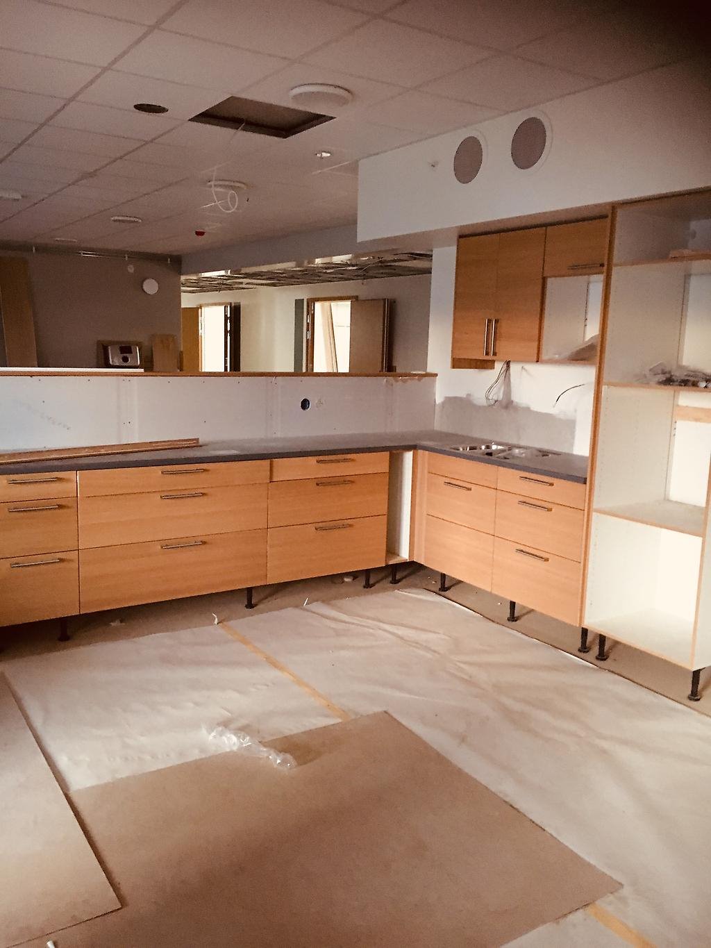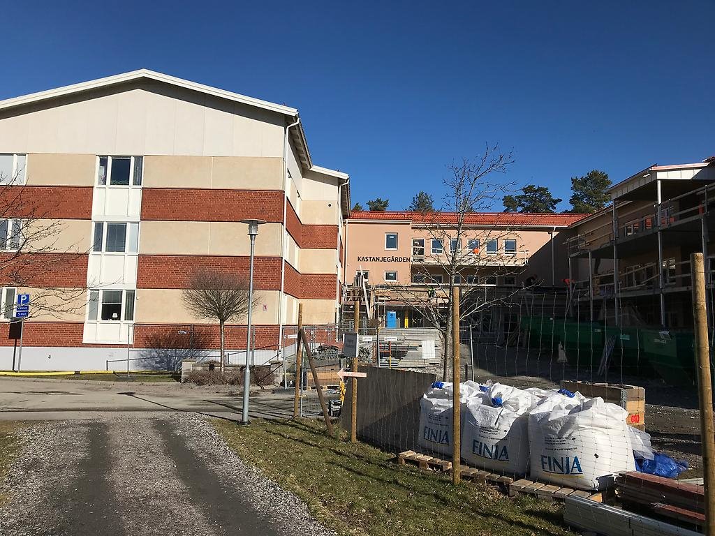 Det går framåt med nybygget på Kastanjegården. Nu är fasaden klar och inomhus börjar en del våningar också bli klara. Snart är arbetet med utemiljön igång.