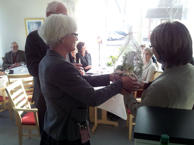 Därefter bjöds det på smörgåstårta inne i träffpunktens lokaler. Christina Raud, styrelseordförande för GötebeBostäder AB, sektorschef Marianne Olsson från Götene kommun samt kommunstyrelsens ordförande Kent Selmosson höll tal och tackade alla inblandade för det fina arbete som har utförts för att få trygghetsboendet färdigt.