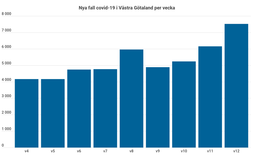 Under förra veckan konstaterades 7 515 nya fall av covid-19 i Västra Götaland. Det är 22 procent fler än föregående vecka och tredje veckan i rad med en ökning. Smittspridningen är stor i hela Västra Götaland. Dessutom har den brittiska mutationen tagit över till allra största delen.