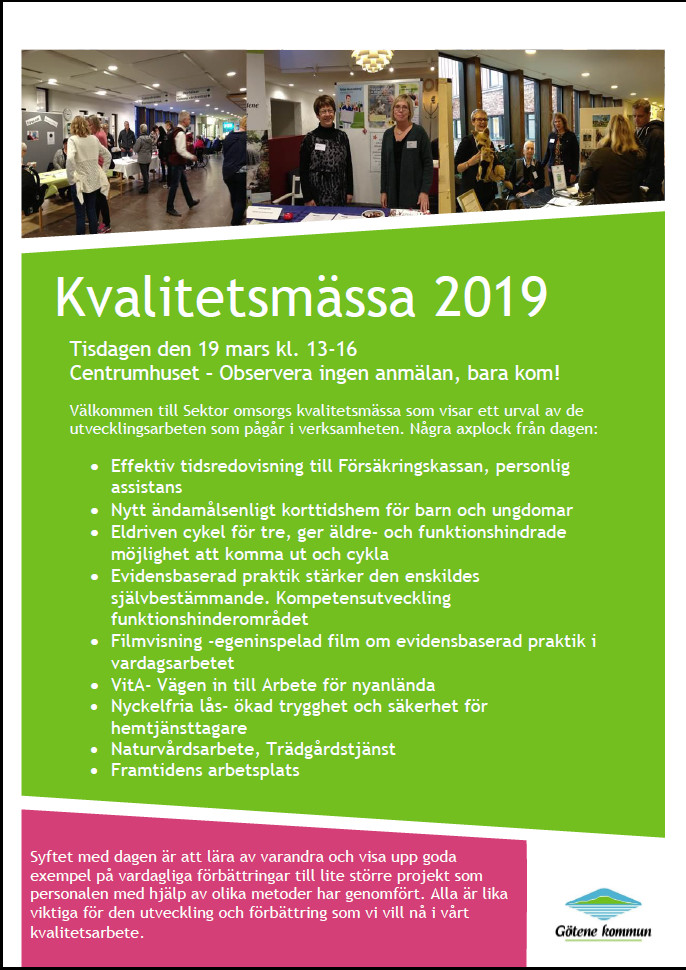 Välkommen den 19 mars 13-16 till sektor omsorgs Kvalitetsmässa i Centrumhuset i Götene. Äldreomsorg, funktionshinder, kommunal hälso-och sjukvård samt arbetsmarknadsenheten visar ett urval av de utvecklingsarbeten och goda exempel som pågår i verksamheten.