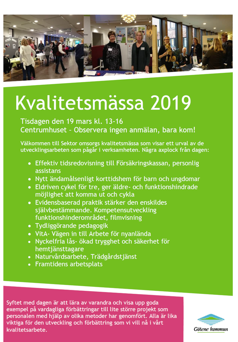 Välkommen den 19 mars klockan 13-16 till sektor omsorgs Kvalitetsmässa i Centrumhuset i Götene. Äldreomsorg, funktionshinder, kommunal hälso-och sjukvård samt arbetsmarknadsenheten visar ett urval av de utvecklingsarbeten och goda exempel som pågår i verksamheten.