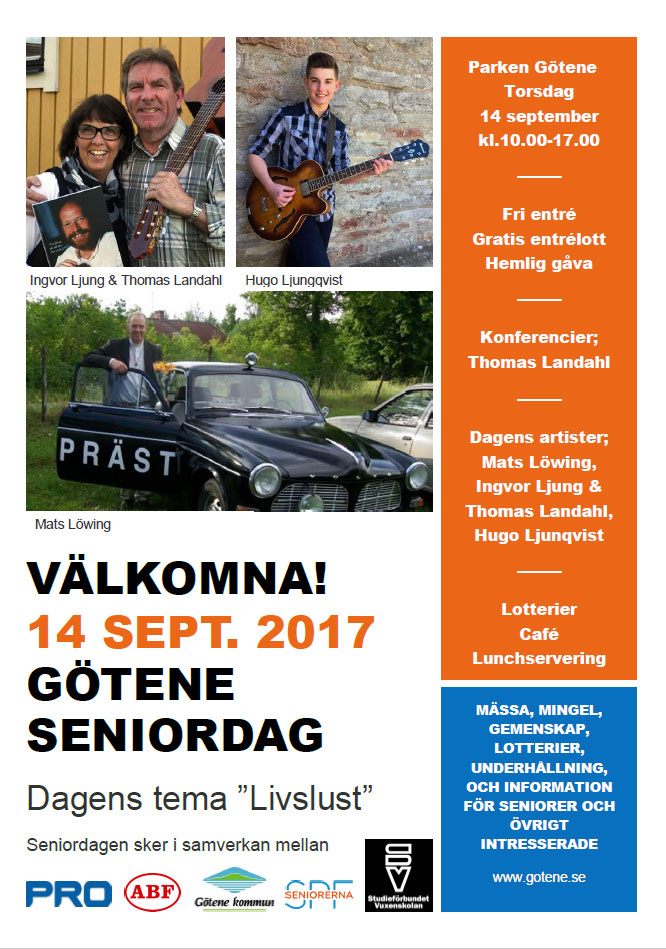 Välkommen till årets Seniordag med ett fullspäckat program innehållande bland annat ett kåseri av Mats Löwing, underhållning av Ingvor Ljung och Thomas Landahl. Sång och musik med Hugo Lungqvist. Utöver detta massor av utställare.