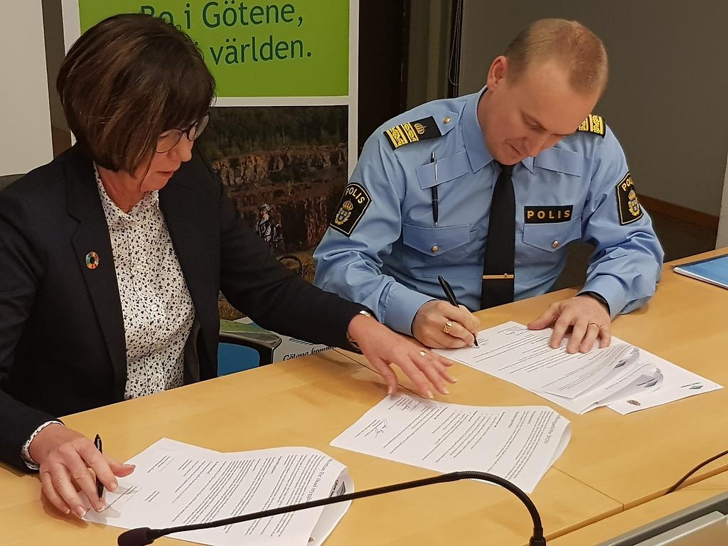 Förstora bildenSusanne Andersson, kommunalråd och Johan Rexhag, lokalpolisområdeschef skriver medborgarlöftet för 2020.