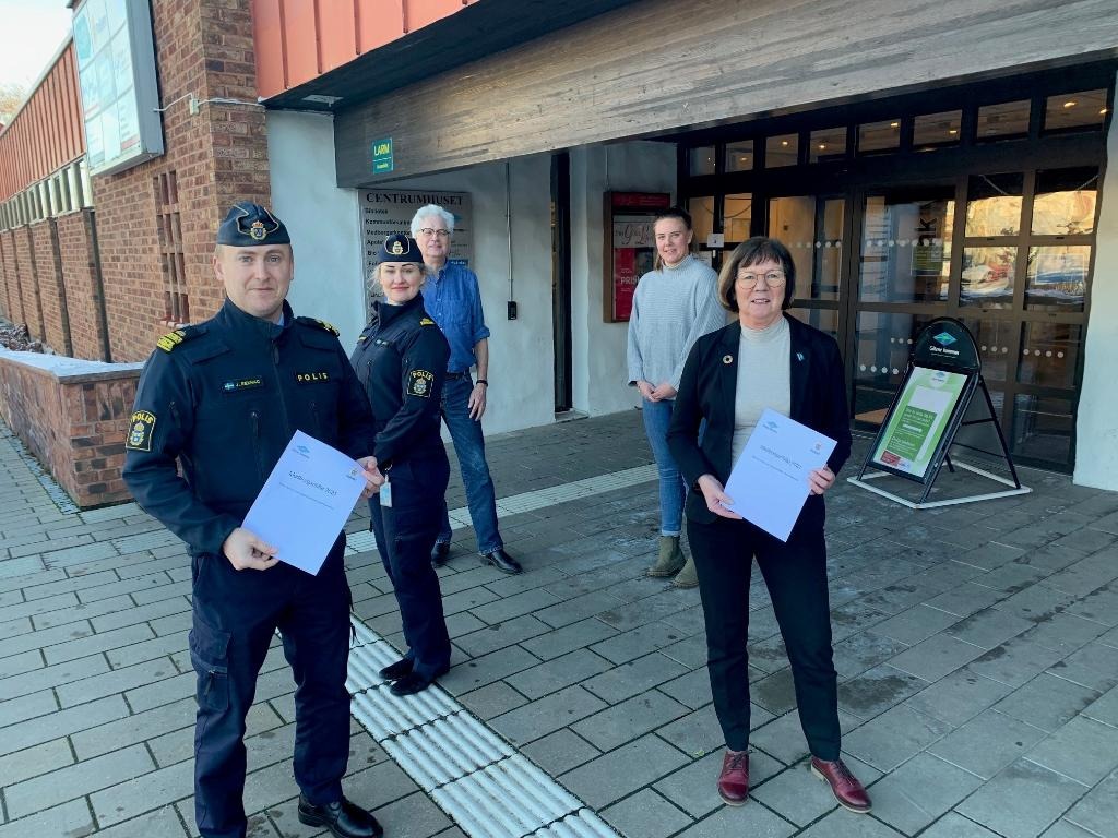 Förstora bildenOmrådespolischef Johan Rexhag, kommunalråd Susanne Andersson, kommunpolis Elisabeth Oliv, Säkerhetssamordnare Dag Högrell och Felicia Abelsson efter påskriften av medborgarlöftet.