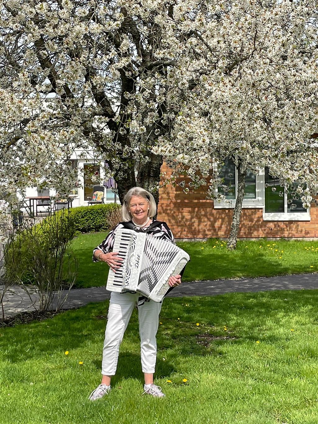 Britt-Marie Stridh spelar dragspel under blommande vårträd