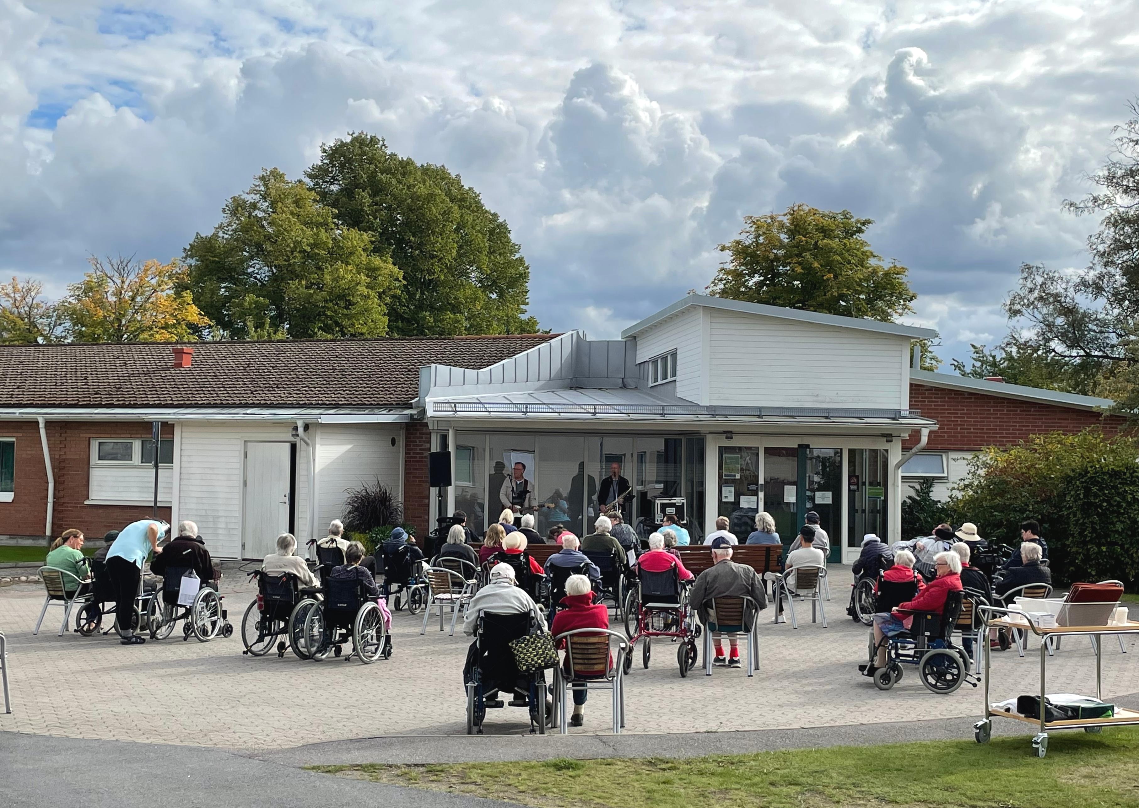 Musikerna bjöd på sann spelglädje och fick med sig publiken i både sång, luftgittar, glada fötter och klappande händer. Musiken spreds över hela äldrecentret denna fina eftermiddag, då solen lyste genom täta moln och vackra höstlöv. Runt 40 personer möttes upp utomhus, men många fler lyssnade till musiken via fönster och ballkonger. Även några förbi passernade hade glädjen att stanna upp och lyssna en stund. Varma applåder ljöd från publiken vilket gav ett extra nummer och musikerna hälsades välkomna åter.