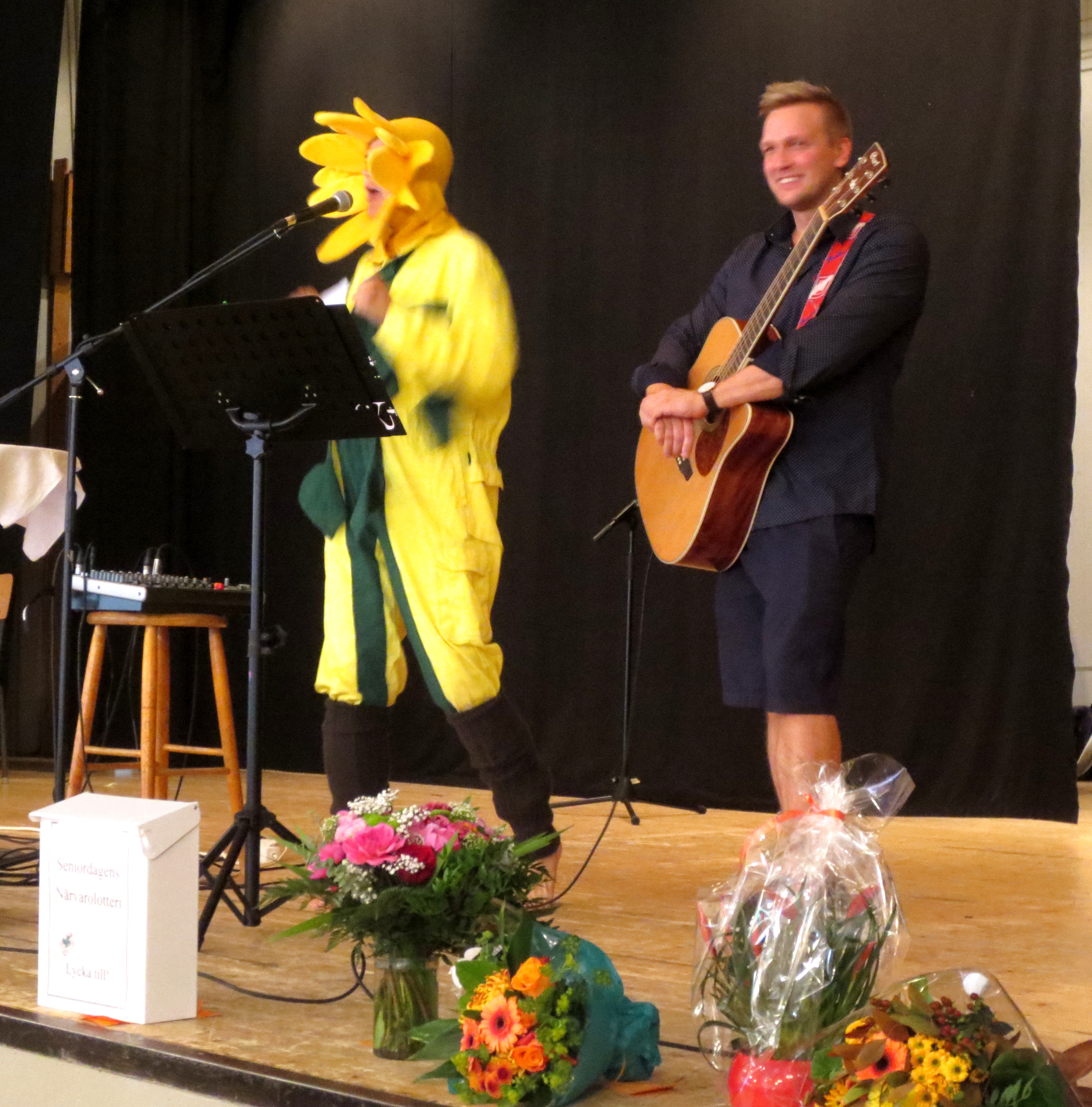 Mitt i musikprogrammet kom konferencier Yvonne Eriksen in på scenen utklädd till solros och kåserade om ”vilket härligt liv blomman har” med att njuta av solen, men även att få ge olja, fågelfrö och frö till frallor. Yvonne har ett företag som heter Fantasiflödet och det fick vi ett fint smakprov av här, hon lotsade som konferencier genom dagens program på ett härligt och positivt sätt