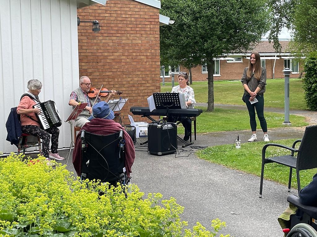 Fin sommarmusik i fint sommarväder spred glädje vid äldrecenter, musikanterna var glada att åter få uppträda inför publik. Ewa Svensson kantor i Svenska kyrkan hade med sig några musikvänner denna dag, Anna Hermansson på sång, Birgitta Bergkvist på dragspel och Odd Malmberg på fiol.
