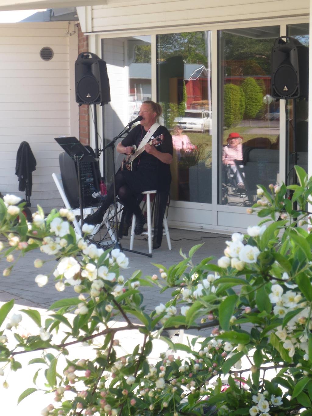 De boende hade samlats ute i det gröna med lagom fysiskt avstånd men till härlig social närhet, just så som vi alla bör mötas i denna tid. Underhållningen har varit mycket uppskattad och är en av de som nu planerats in vid Äldrecenter. - Underhållning utomhus är väderberoende och hittills har vi haft turen på vår sida hälsar Barbro Hallberg frivilligsamordnare som samordnar dessa aktiviteter.