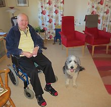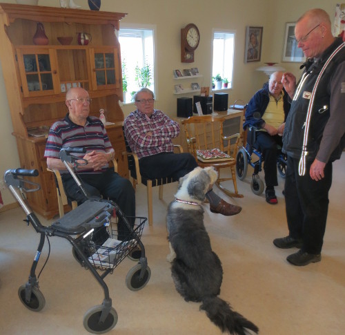 Gordon hette dagens huvudperson, en Bearded collie som besökte Äldrecenter tillsammans med matte och husse.