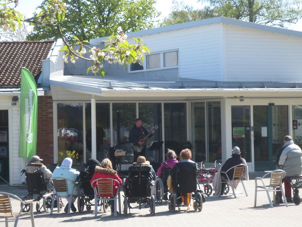 Solen lyste, vårvinden smekte våra kinder och Henrik Strömberg, sångare i Scotts orkester, sjöng och spelade för oss. Vi samlades ute i trädgården, en del lyssnade från fönstren. Vi njöt av sol, fin underhållning och samvaro men höll det fysiska avståndet. För många äldre känns det tryggt när en personal sitter bredvid och kan hålla handen därför kan det på bilden se ut som vi sitter tätt men då för att skapa trygghet.