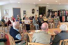 Vårens mode går i marinblått, rosa och sandfärgat. I måndags hade Hällekis träffpunkt modevisning och klädförsäljning för ett 25-tal modemedvetna besökare.