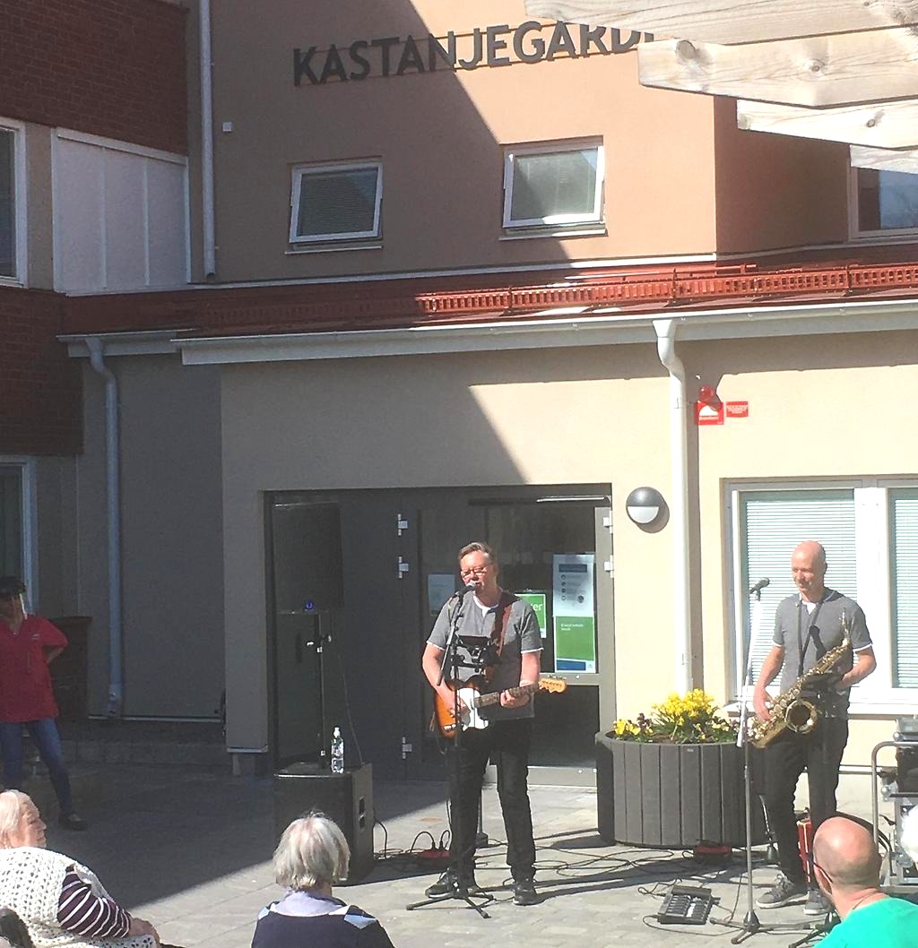 I härlig sommarvärme bjöds det på underhållning den 20 april utanför Kastanjegården, Ceciliagården och Torstensgården. Det var de boendenas första besök av musik för våren men inte den sista. Fler underhållningar och aktiviteter finns redan inplanerade vid Äldrecenter.