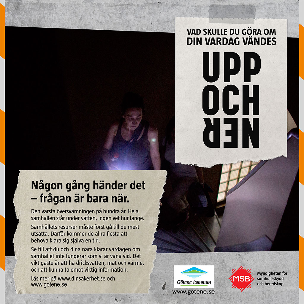 Under veckan kommer du få ta del av korta filmklipp, affischer, informativa texter med mera för att ge dig mer kunskap om hur du kan klara dig i hemmet under en samhällskris. Imorgon kommer du få reda på hur du kan kommunicera om det till exempel är ett längre strömavbrott, och längre fram i veckan kommer du få information om några av de samhällskriser som kan drabba Götene kommun och hur du bäst förbereder dig.