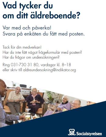 Nu startar årets enkätundersökning från Socialstyrelsen: Vad tycker de äldre om äldreomsorgen? Var med och påverka - svara på enkäten du har fått på posten!