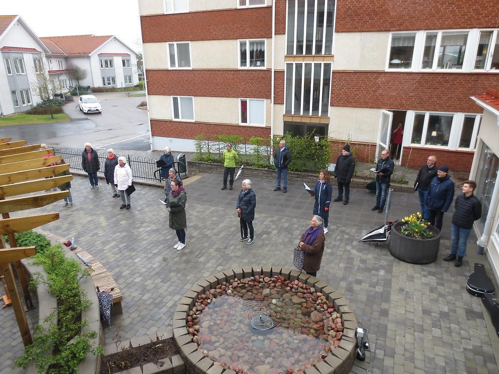 Hugo Ljunqvist var med och kompade på gitarr samt framförde en egenskriven låt. Ett mycket fint och uppskattat program med blandade kända vårsånger framfördes på fem olika platser runt äldrecenters boenden. De äldre satt i fönstren, på balkonger och altaner. Kören stod utanför med lagom avstånd från varandra för att på ett rådigt vis sprida glädje och värme med sång.