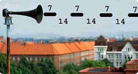 Sju sekunder långa ljudstötar med 14 sekunders paus emellan. Signalen upprepas under minst två minuter.