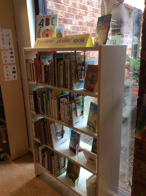 Biblioteket kan nu stoltsera med en ny bokhylla fylld av barnböcker på olika språk. Välkomna in att låna!