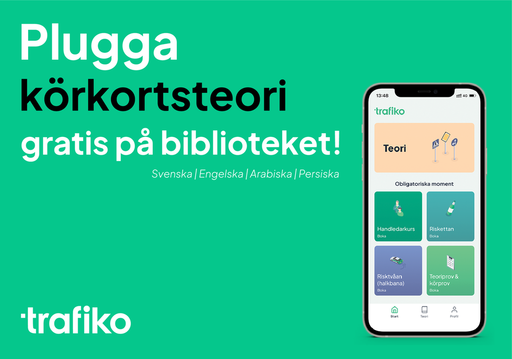 Nu kan du studera körkortsteori gratis med Trafiko på biblioteket. Anslut till bibliotekets WiFi (GoliskaOPEN) för att få tillgång till videor, körkortsfrågor, e-bok och ljudbok. Teorin finns på svenska, engelska, persiska och arabiska.