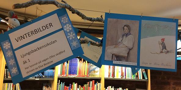 Eleverna i årskurs 1 på Ljungsbackenskolan har lyssnat på sagan Olles skidfärd av Elsa Beskow. Med berättelsen som inspiration har de sedan målat vinterbilder. Bilderna finns att se i bibliotekets barnavdelning under hela vecka 7.