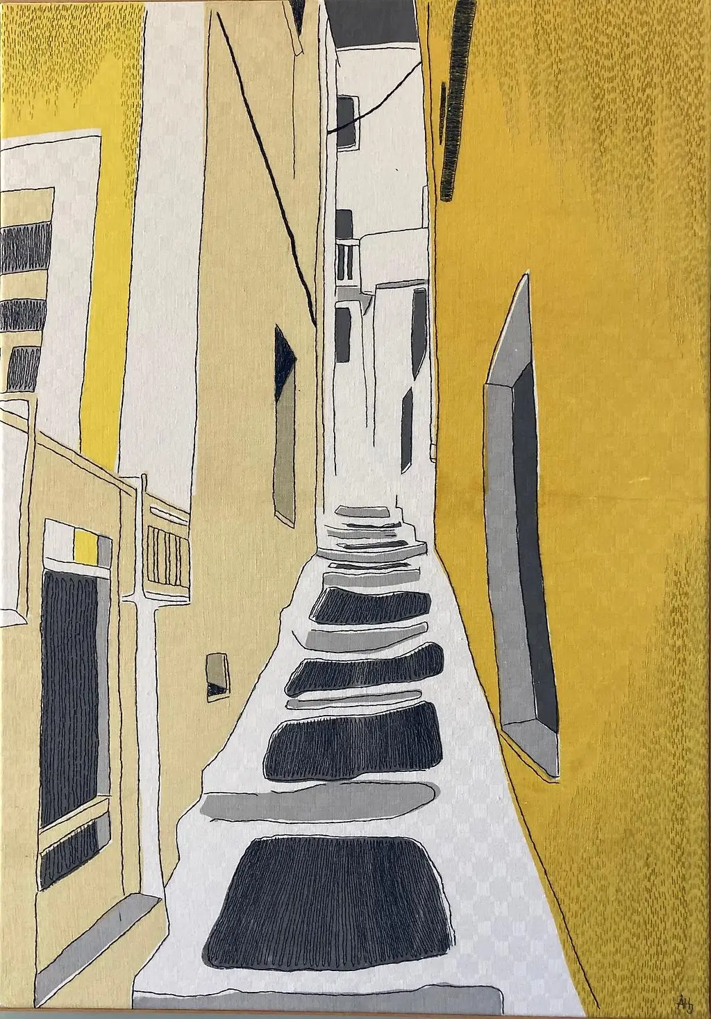 För Åsa är det viktigt att vara närvarande på de platser som gestaltas, insupa atmosfärer, känslor och dofter. Färgytor trycks med hjälp av pappersschabloner och konturer broderas med tråd. En process som är direkt, men samtidigt väldigt långsam.