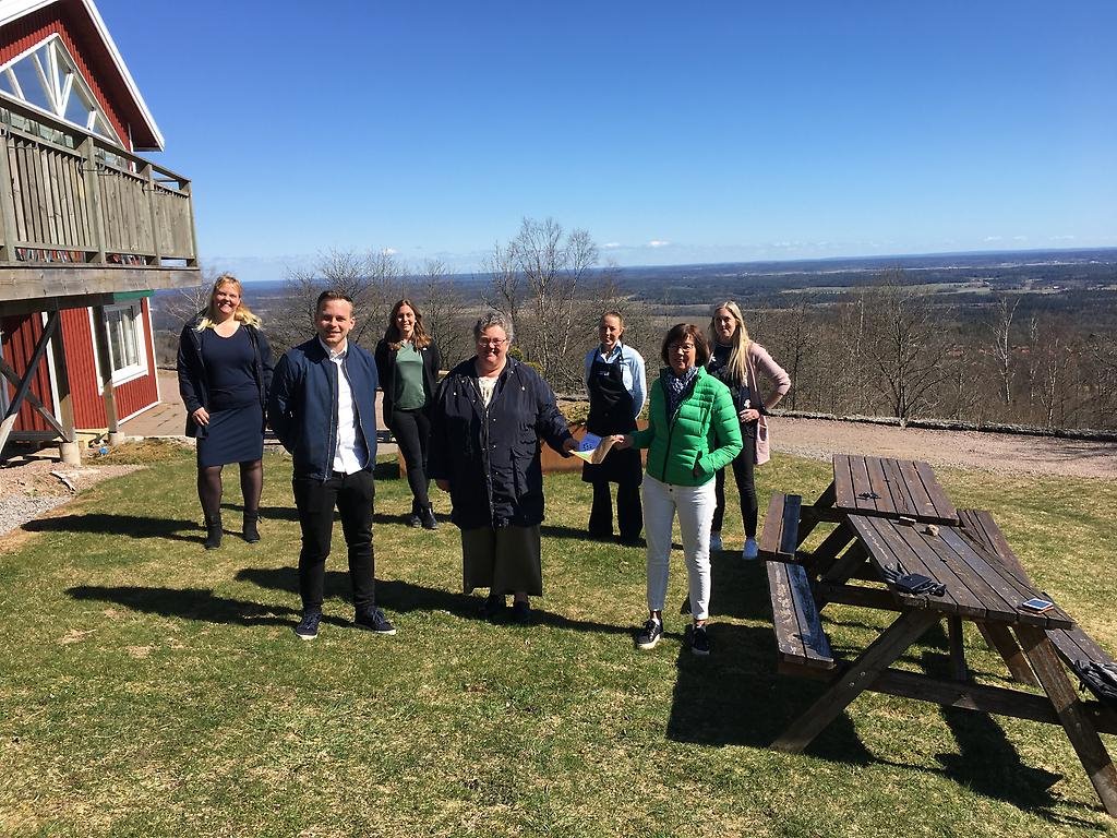Från vänster: Johan Månsson vice ordförande kommunstyrelsen, oppositionsråd Åsa Karlsson, kommunalråd Susanne Andersson framför Kinnekullegården. Bakre rad: Juliane Thorin Kommunutvecklare, Emelie Thim, Näringslivsstrateg, Emma Lundström Kinnekullegården, Anna Ohlin Ek, VD Destination Läckö Kinnekulle.