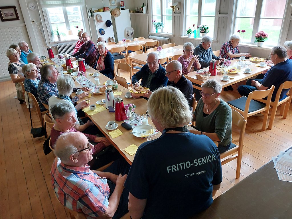 Kaffe, smörgås och kaka stod vackert uppdukat när gästerna kom, några vana volontärer var behälpliga att iordningställa. Det var samma gäng som tidigare år när Träffpunkten var öppen som nu åter är med som stöd för Fritid Senior som ansvarar för verksamheten, vilket är en del av kommunens Kultur och Fritid.