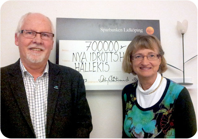 Sparbanken Lidköpings VD Erling Håstrand överlämnade i dag, till kommunstyrelsens ordförande Kenth Selmonsson och kommunstyrelsens andre vice ordförande Ann-Marie Widegren, en check på 700 000 kronor till Hällekis idrottshalls läktare.