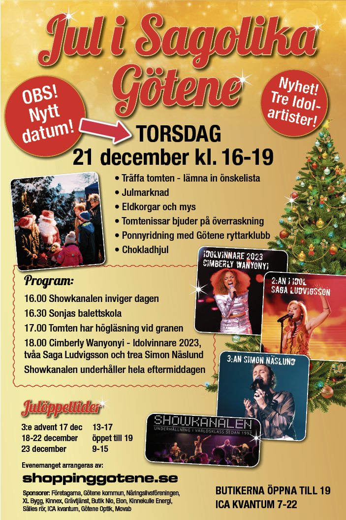 Mysig julhandel i Götene! Tre Idolartister kommer! OBS NYTT DATUM: 21 december klockan 16.00 till 19.00.