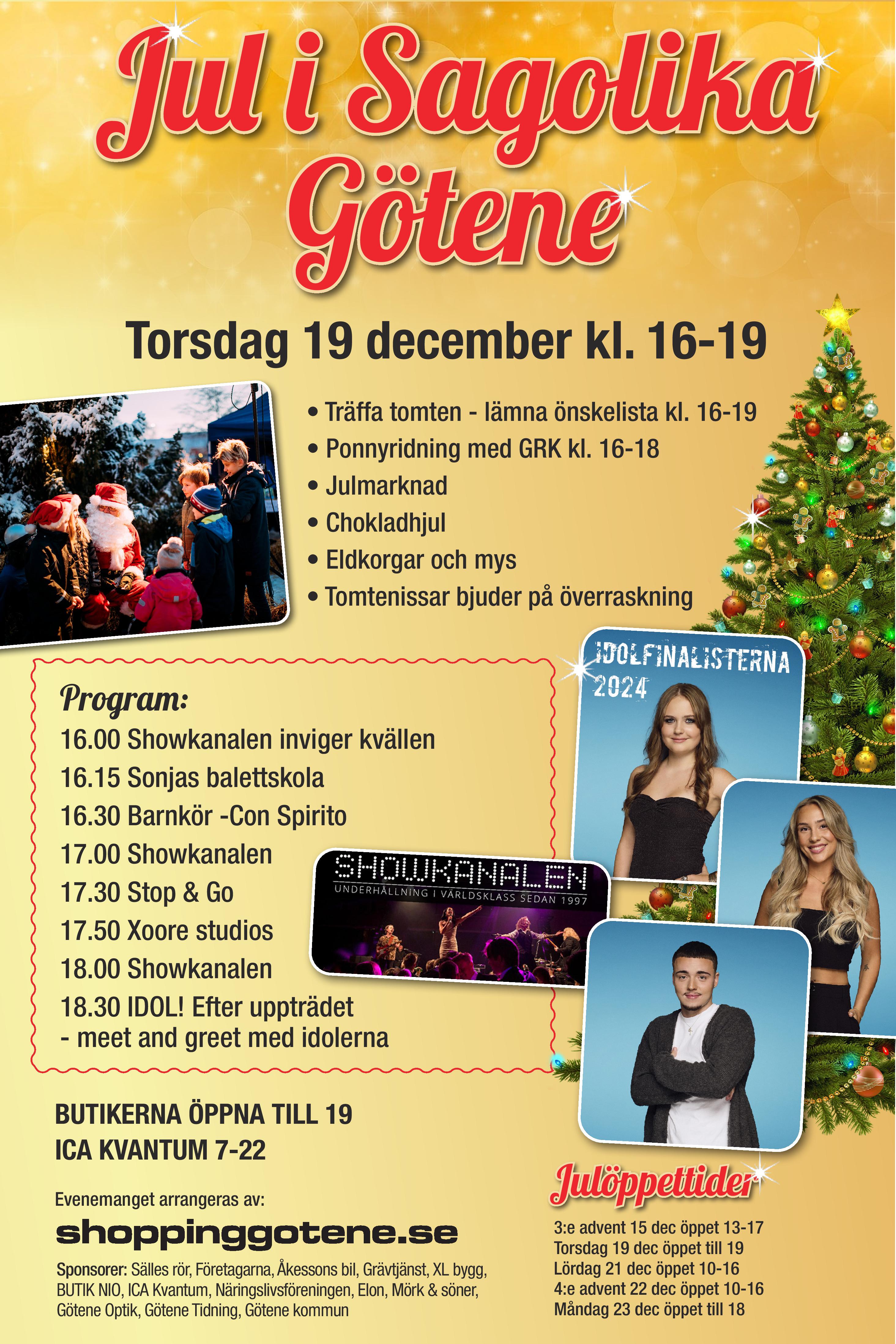 Torsdag den 19 december klockan 16 till 19 är det dags för Jul i Sagolika Götene. Mysig julhandel i Götene. Idolvinnare 2024 och två finalister kommer i år!