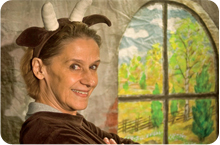 Varför är Mamma Mu inne i lagården när det är en så fin dag. Hon har fått ett sår på magen och en bula i pannan. Barnteater av Jujja Wieslander framförs av Tomas K Teater.