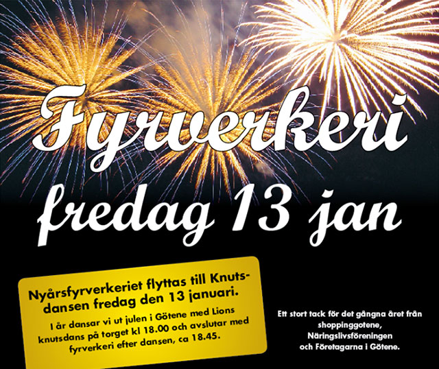 Fredag den 13 januari klockan 18.00. I år dansar vi ut julen i Götene med Lions knutsdans på torget klockan 18 och avslutar med fyrverkeri efter dansen cirka klockan 18:45.