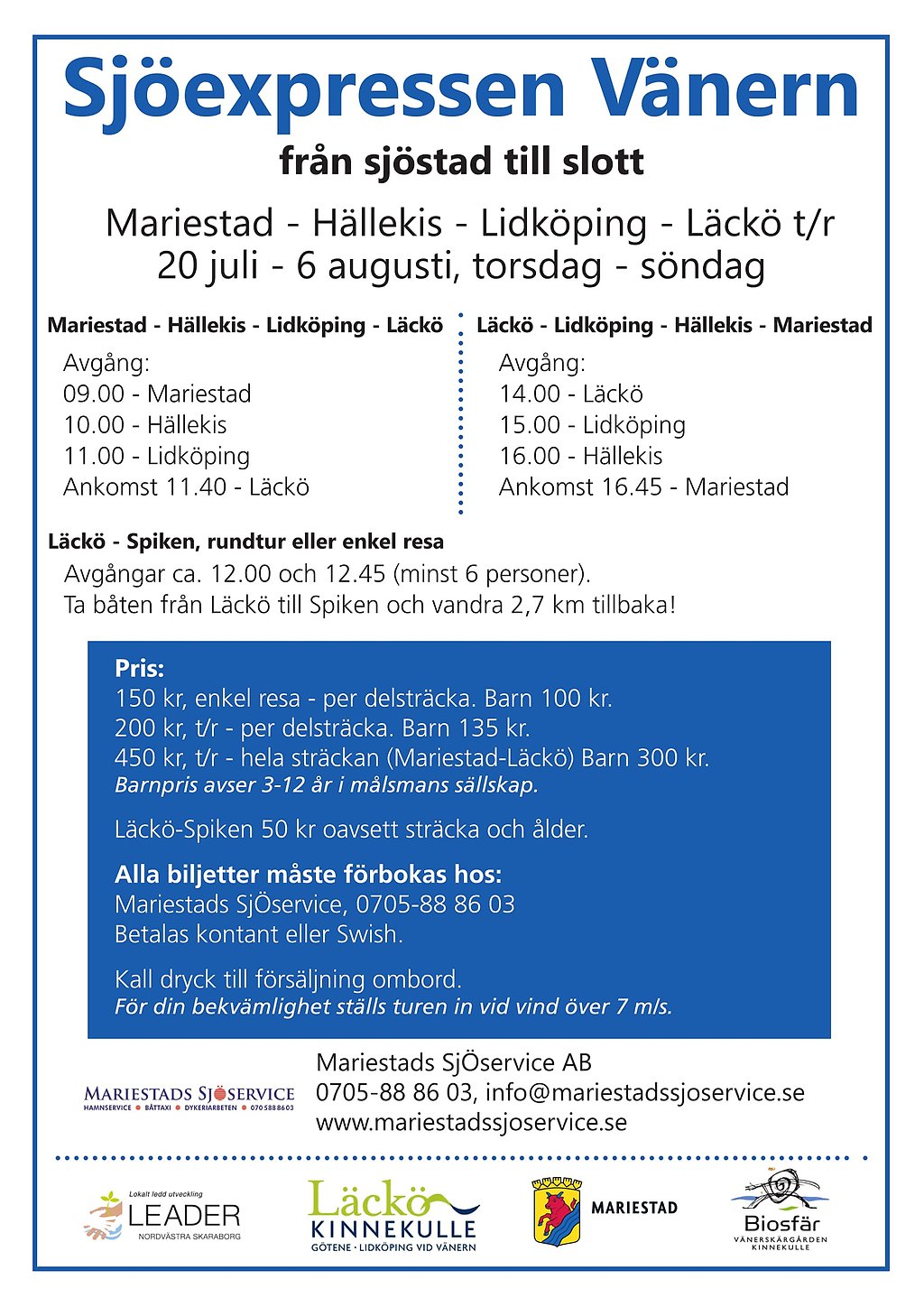 Under veckorna 29 till 31, kommer Sjöexpressen Vänern trafikera Mariestad – Kinnekulle/Hällekis – Lidköping – Läckö Slott och Spiken.